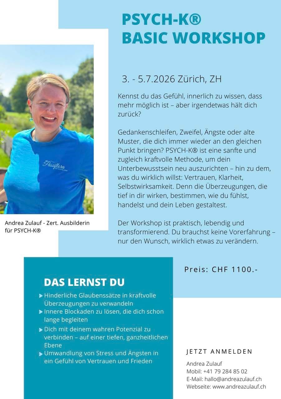 Wir freuen das Andrea zu uns kommt um den PSYCH-K Basis Workshop bei uns zu leiten.